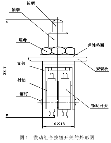 微動組合按鈕開關(guān)將兩個微動開關(guān)用鉚釘固定在支架部件上組合而成。在支架上鉚有套管,利用套管上的螺紋可將開關(guān)用螺母固定在安裝板上。